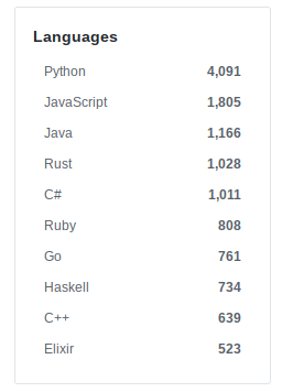 - If I had to guess, I would have picked JavaScript to be the most popular language. But as you can see it only comes in second. Ruby, Go and C# are also unsurprising entries on this list, but Haskell and Elixir are -- to me at least. These two functional languages seem to have quite a bit of buzz around them and people passionately seem to pick these languages as their language of choice, which is interesting as I know very little about either. Fun side note: even the creator of Elixir participates in AoC!