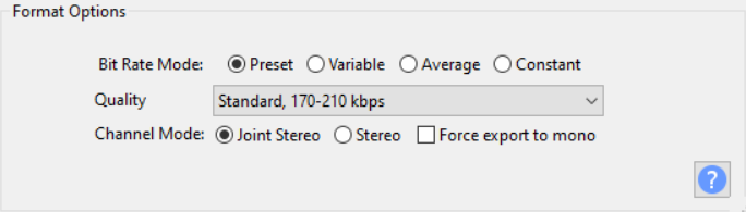 I use the default settings. Audacity does the mix for you when you export your project (File->Export->Export as MP3). So I don't mix everything down to one file before exporting (Tracks->Mix), there is no reason and you can't really tweak your project anymore afterwards.