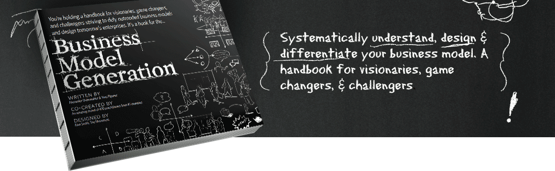 It is a bit different. The idea behind the BMC is explained in a book called Business Model Generation. You can already tell when you hold the book that it is different. The landscape shape will stick out of any bookcase and it has beautiful typography. It is written by Alex Osterwalder but not by him alone. The book is created in a sort of crowd sourced way. Over 400 business and management experts provided Alex their input. I know what your thinking: that this model has become overly complex. But the opposite is true, this process has resulted in a very clear, usable, understandable, adaptable model you can use to visualize and challenge what it is your are doing with your business.