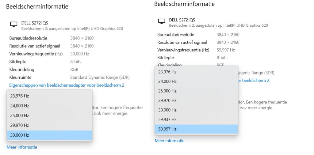 When I installed my new monitor -- the Dell S2721QS -- and attached it to my Dell laptop, something felt... off. I couldn't quite put my finger on it, the resolution was fine (3840 x 2160), screen was fine -- brightness, contrast etc. -- but the overall experience was more sluggish. Especially when moving my mouse. Ah of course, this new resolution calls for different mouse speed settings! But after fiddling endlessly with those settings I concluded: that ain't it.