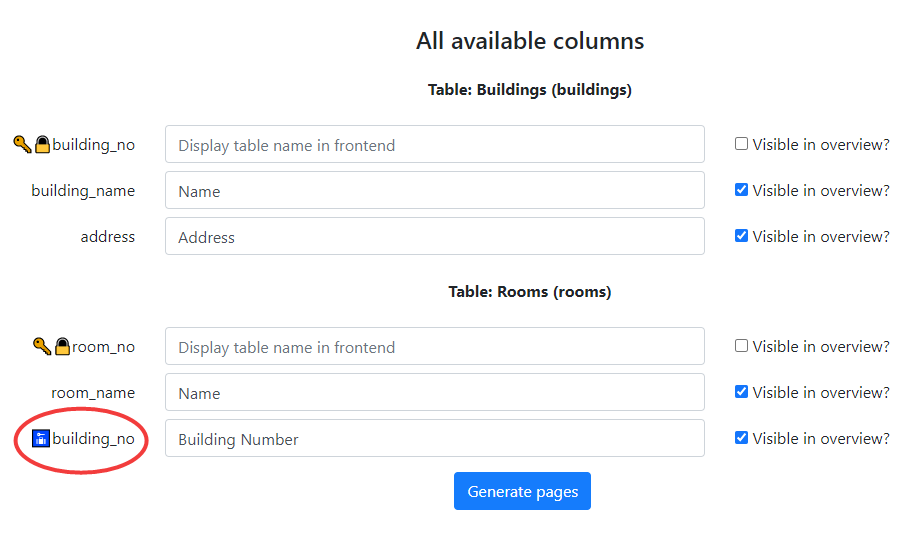 In the column form columns with foreign keys are indicated by the blue icon.