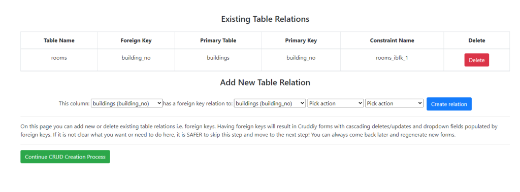 Note 1: the table relationship builder is the first step in the Cruddiy CRUD creation process. However it is completely safe to ignore this step and move to the next step! I would even strongly advise doing so if you are not sure what you need to do, because it might break things. Also if you just want one or a couple of simple unrelated forms it is perfectly safe to skip this step.