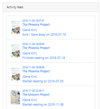 Every new action is added to the book log. In the frontend the last 25 entries to the book log are presented as the Activity feed. Every action has a timestamp when an action got logged and a date for that action. Which are two different things. So when I now add a book to my shelf that I acquired 4 years ago, the book log timestamp is now, but the date for the action is 4 years ago.