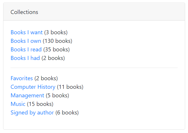 In the frontend the action log statesand the different lists are grouped together under the Collections card. As stated the first 4 collections are populated from the log, and a book always has a last state. The others are just lists.