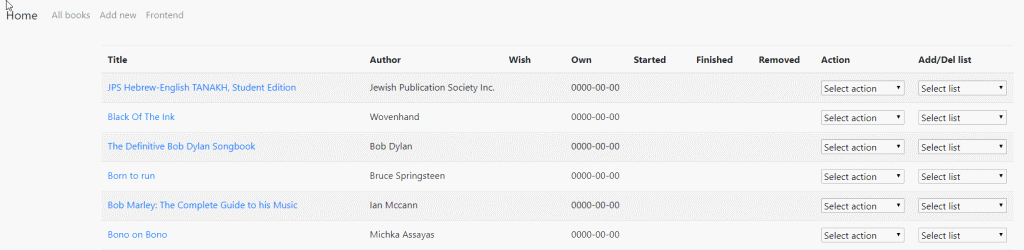 The bol.com search API is the start page of my backend. The other important backend page is an overview of all my books. Clicking on the titles brings up an edit view of a book.But most importantly I can quickly add or delete books from lists here AND add actions (started reading, finished).