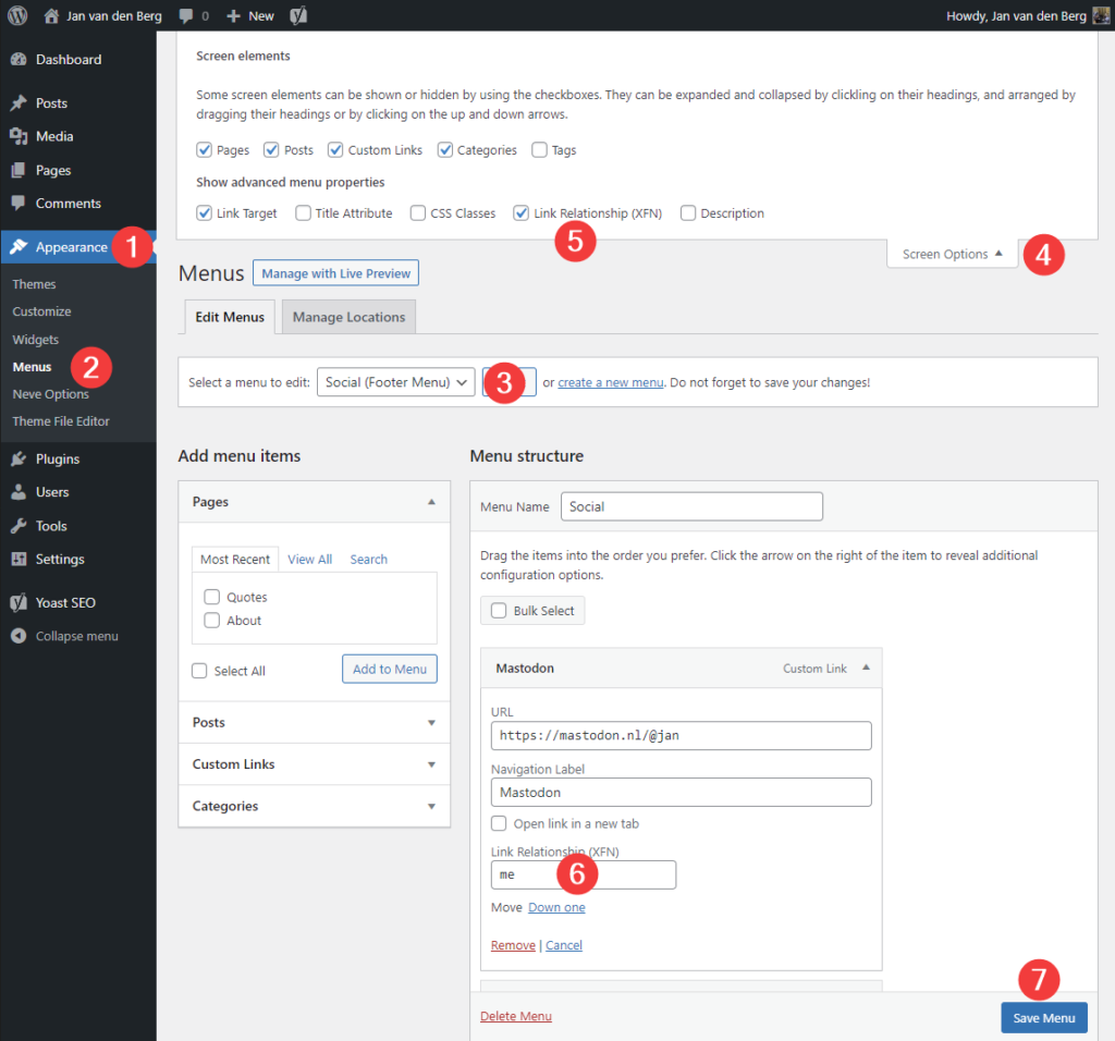 I link to my social media profiles from a menu. My guess is that most people want to use it like this. And one of these links in my menu is a Mastodon link. This is the link where you need to add the mevalue for the relattribute.