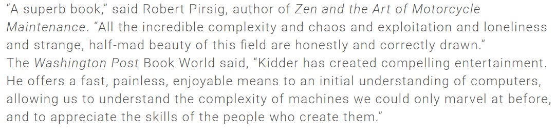- Sure, this is a technical book of how a new computer was designed and built but at the heart this book is about people, relations, teamwork and leadership. The timelessness of this book is embodied not in the technical details but in the stories of how these people worked together and achieved their goals. (For lack of a better term, you could call it a management book.) And that is exactly what I like about it. I will probably forget the technical parts, no matter how interesting, but the colorful people, their backstories, motivation and relentless dedication will stay with you. I kept thinking I would also love to read such a book about people designing the original iPhone. The technical details would probably be different, but here's the thing: I suspect there also would probably be a lot of similarities between them and this team from the 70s.Because in the end it's about people trying to create something unique.